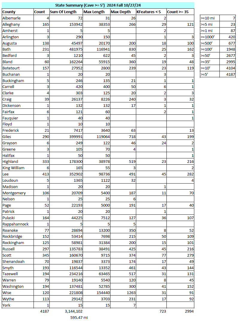 Mike Futrell has put together an updated database report for the October 2024 VSS Meeting. The report includes every known cave and "karst features" from every county containing a reported cave in the Commonwealth of Virginia.